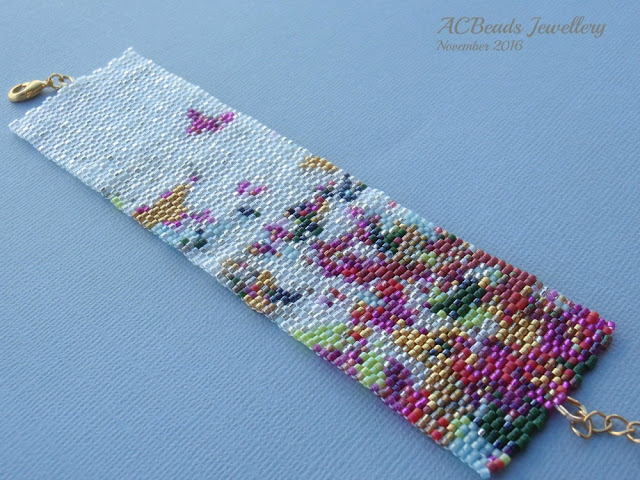 I was very lucky to have an order for two cuff bracelets in beadweaving. One was the Fluttering Butterflies that I had already made for the Butterfly Challenge Blog Hop (blog post here) - this time I made another one - and the other was the same pattern but in a different colour scheme using cream, gold, yellow, and grey. I was surprised how good the final result was, considering the many different colours but mostly the undefined, impressionist pattern.